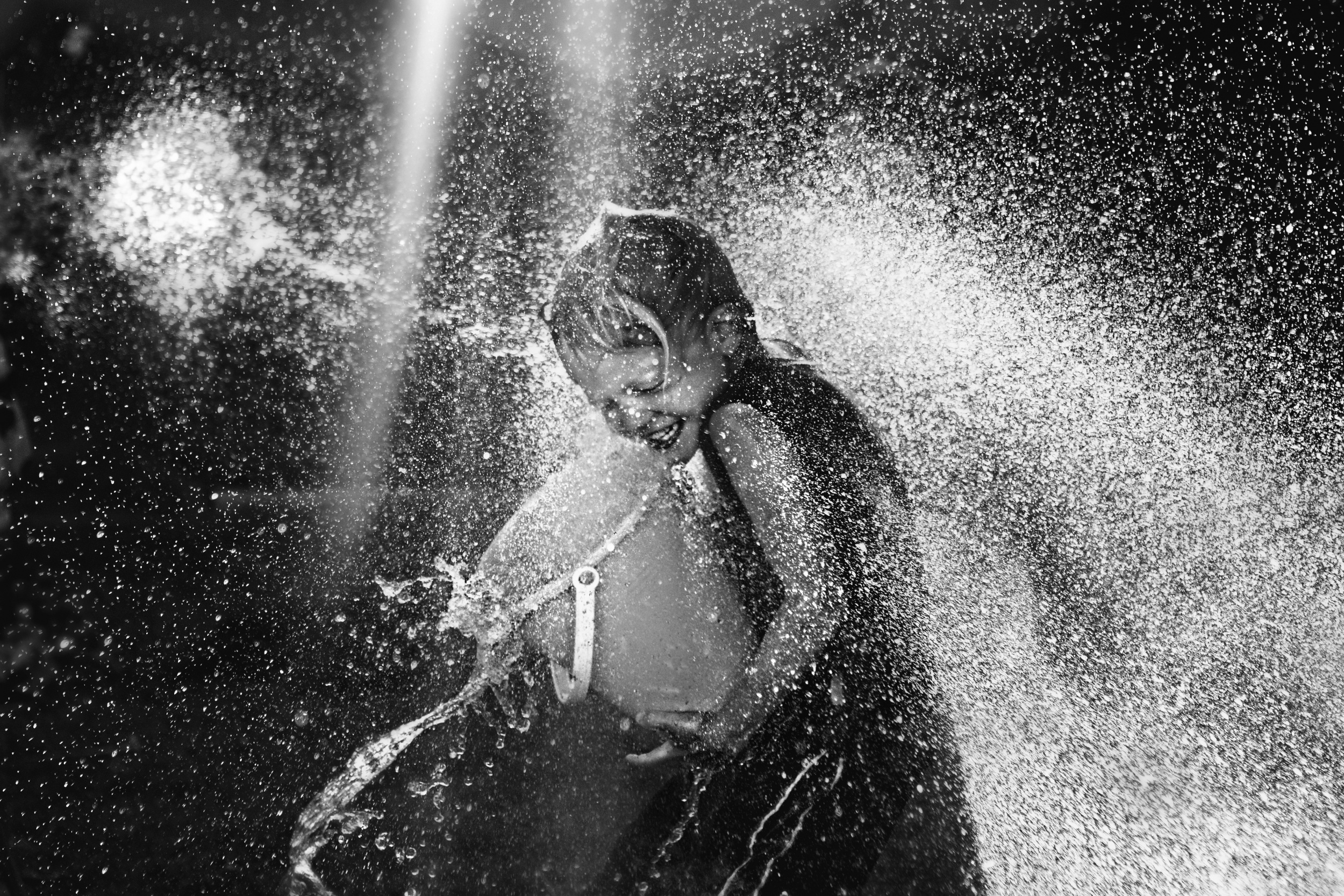It's a picture of my son, who was 6 at the time, getting completely soaked with the hose by his father during an epic water battle in our backyard on a sweltering summer's day in the high desert of Southern California. The look of gleeful defeat on his face is priceless, and his smile is contagious. It's a perfect childhood memory of a summer's day. I remember it like it was yesterday — my useless lens hood kept falling off, hence the harsh lens flare at the top of the image. Funny enough, this ended up sparking debates online, with some people insisting that it was shot with an off-camera flash instead of backlit sunlight. I read the comments with mild amusement, as strangers argued about how I took a photo that was about as unplanned as they come!